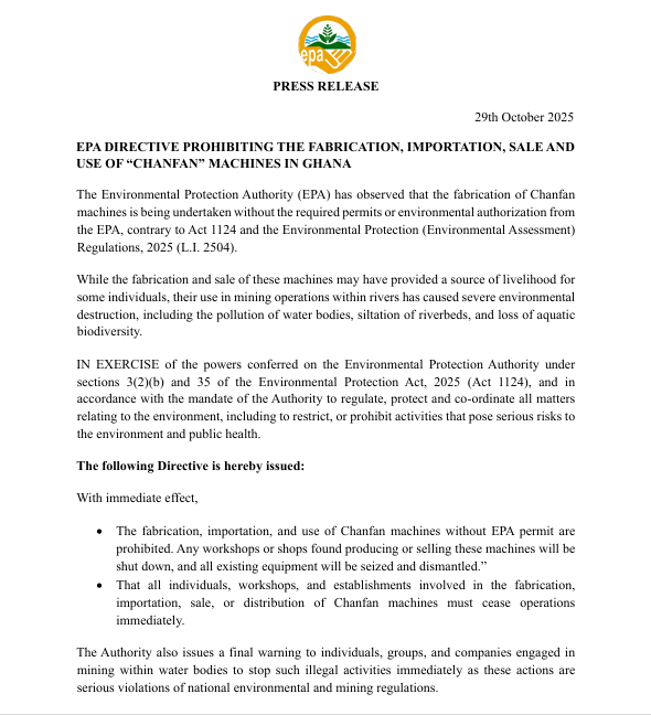 The Environmental Protection Authority (EPA) has announced an immediate ban on the fabrication, importation, sale, and use of “Chanfan” machines across Ghana.