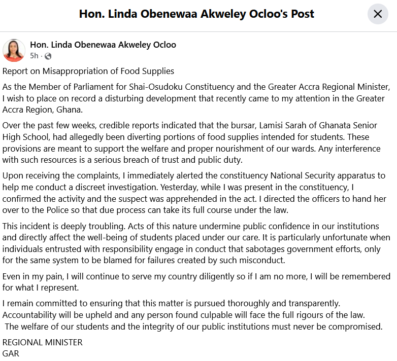 According to the Minister, her office received credible reports in recent weeks indicating that the bursar had been diverting portions of food provisions meant to support student welfare and nutrition.