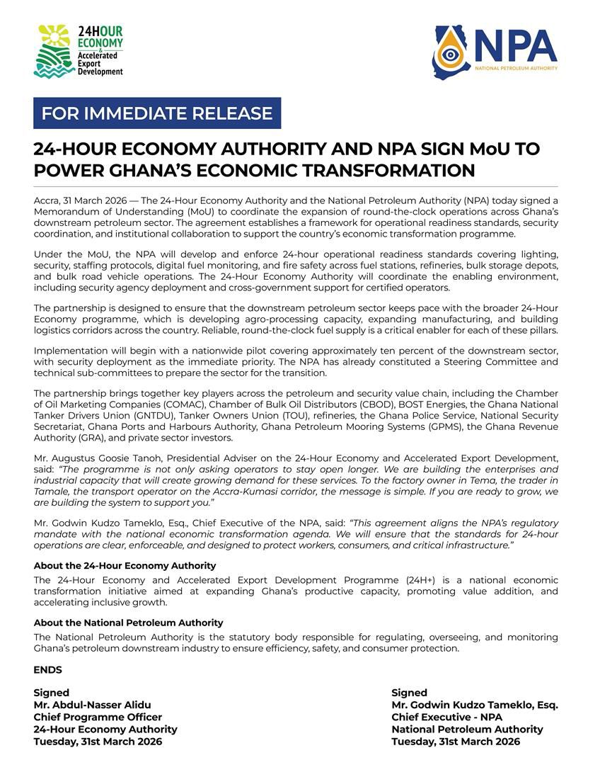 The 24-Hour Economy Authority and the National Petroleum Authority have signed a Memorandum of Understanding (MoU) to support the expansion of 24-hour operations across Ghana’s downstream petroleum sector.