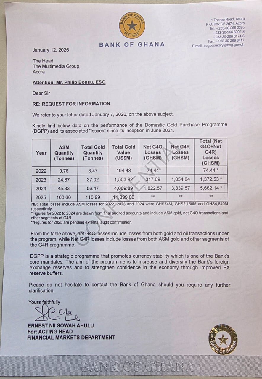 The Bank of Ghana (BoG) has disclosed a significant rise in losses under its Domestic Gold Purchase Programme (DGPP), with figures hitting GHS 5.66 billion in 2024.