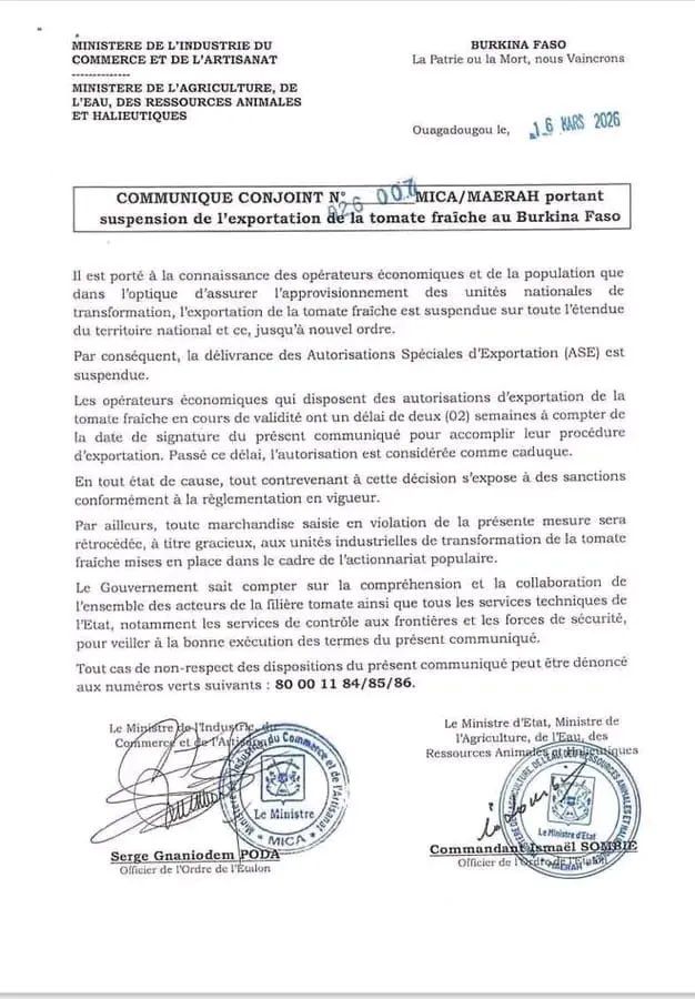 In a joint statement issued in Ouagadougou, the Burkinabè government announced an immediate nationwide halt to tomato exports “until further notice,” explaining that the move is intended to prioritise domestic supply for local processing industries.