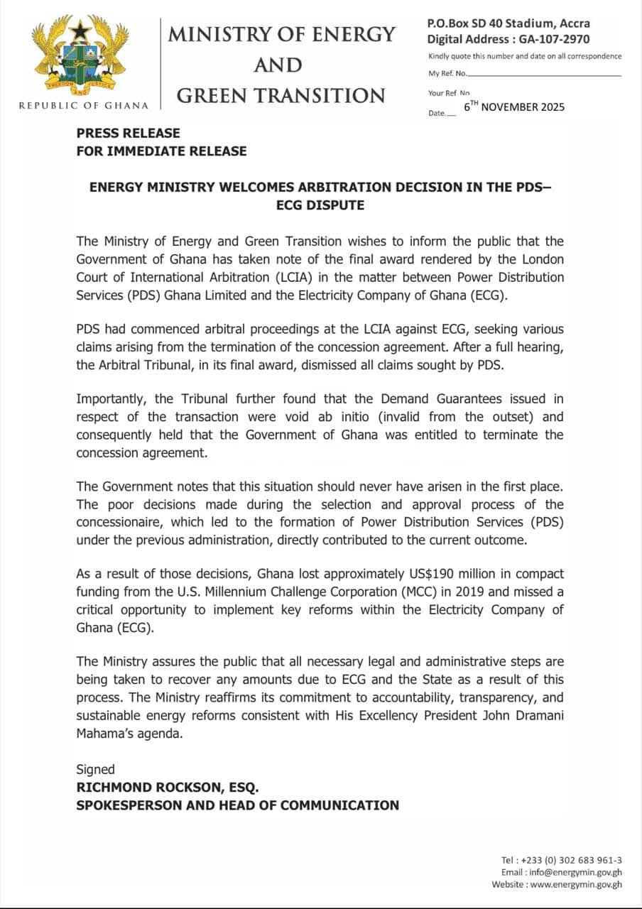 In a statement issued on Thursday, November 6, the ministry announced that the tribunal’s decision vindicates the government’s termination of the PDS concession agreement. The LCIA ruled that the demand guarantees issued for the PDS–ECG transaction were void ab initio (invalid from the outset), confirming that the Government of Ghana acted within its rights to cancel the deal.