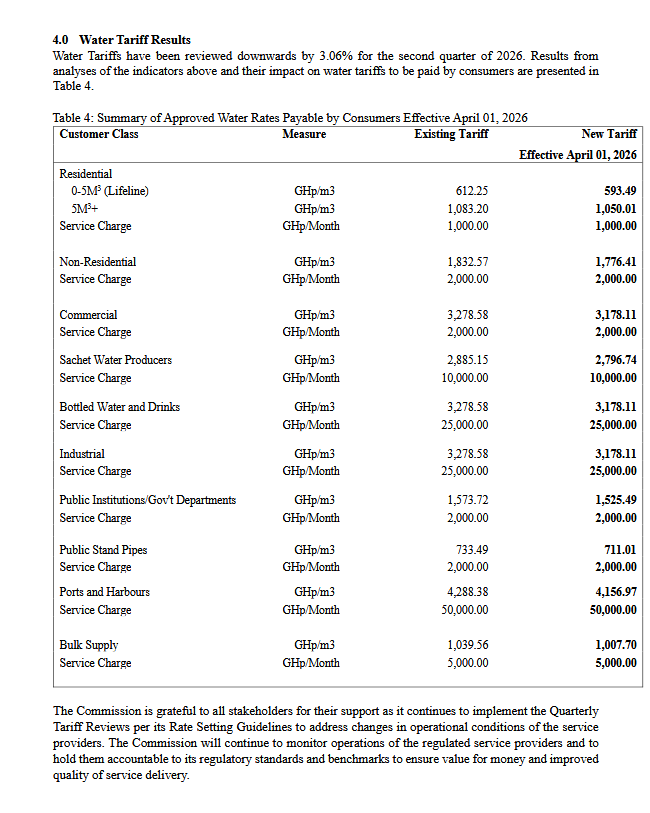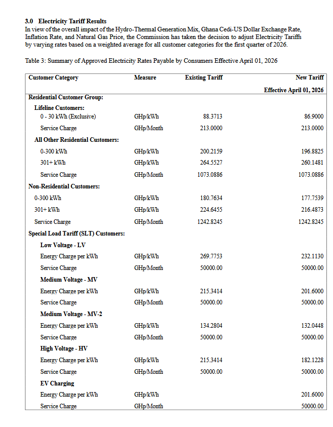 The electricity and water tariffs cut announced by the Public Utilities Regulatory Commission (PURC) takes effect today, April 1, 2026.