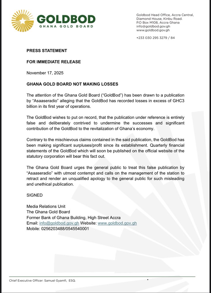 The statement further urged the public to disregard the report, calling it misleading and unethical. GoldBod also demanded a full retraction and an unqualified apology from the management of Asaase Radio for what it described as irresponsible journalism.