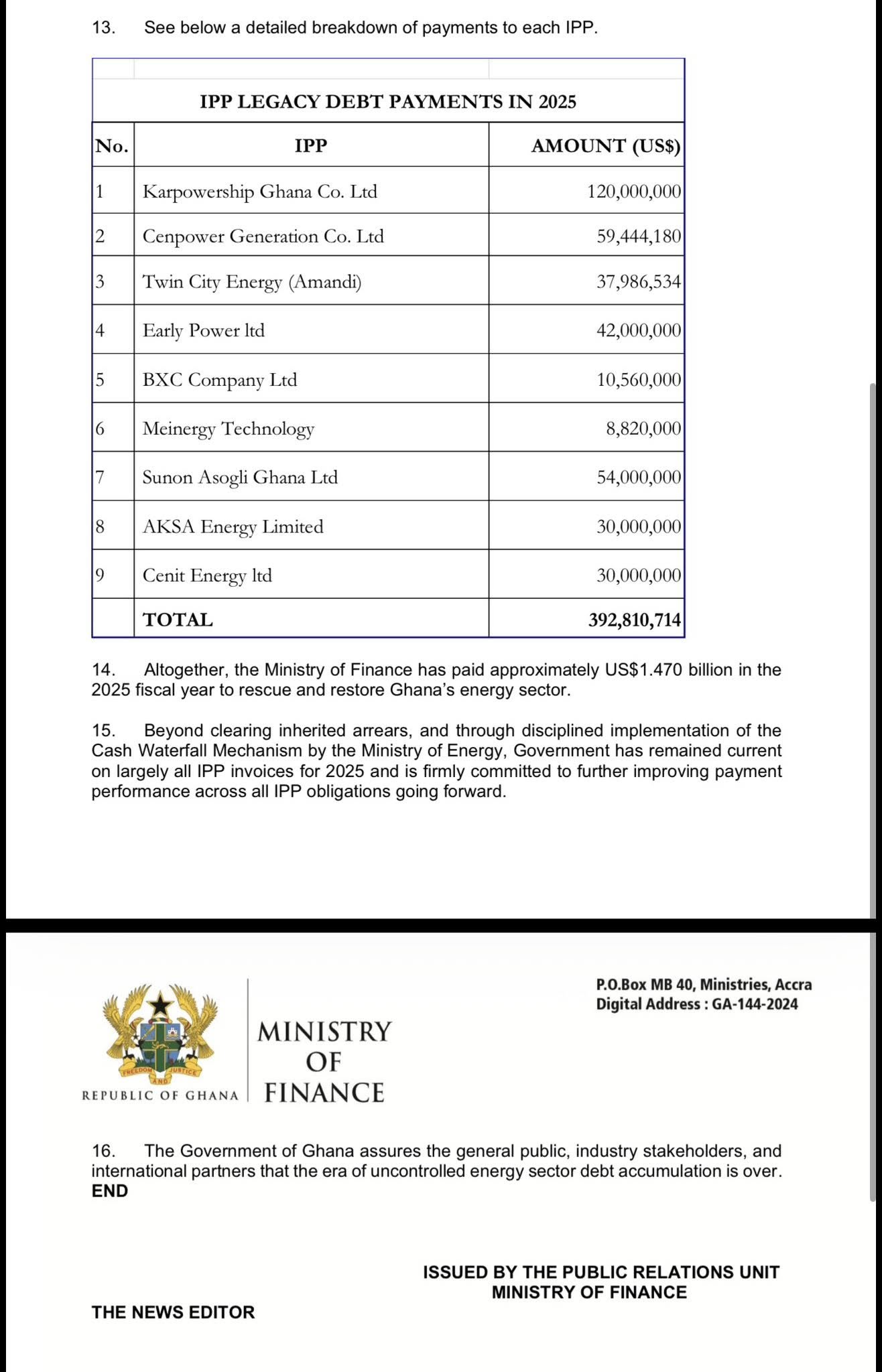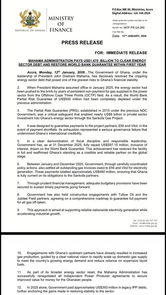 “The Government of Ghana, under the leadership of President John Dramani Mahama, has decisively resolved the crippling energy sector debt that posed one of the gravest risks to Ghana’s financial stability,” the statement said.