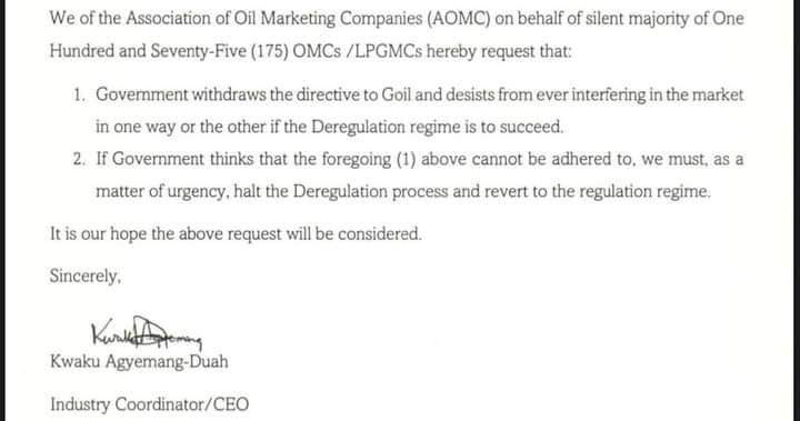 The umbrella body for oil marketing companies in Ghana, the Association of Oil Marketing Companies (AOMC) has said its 175 members want the government to rescind the directive to GOIL to reduce the price of petrol and diesel per litre.