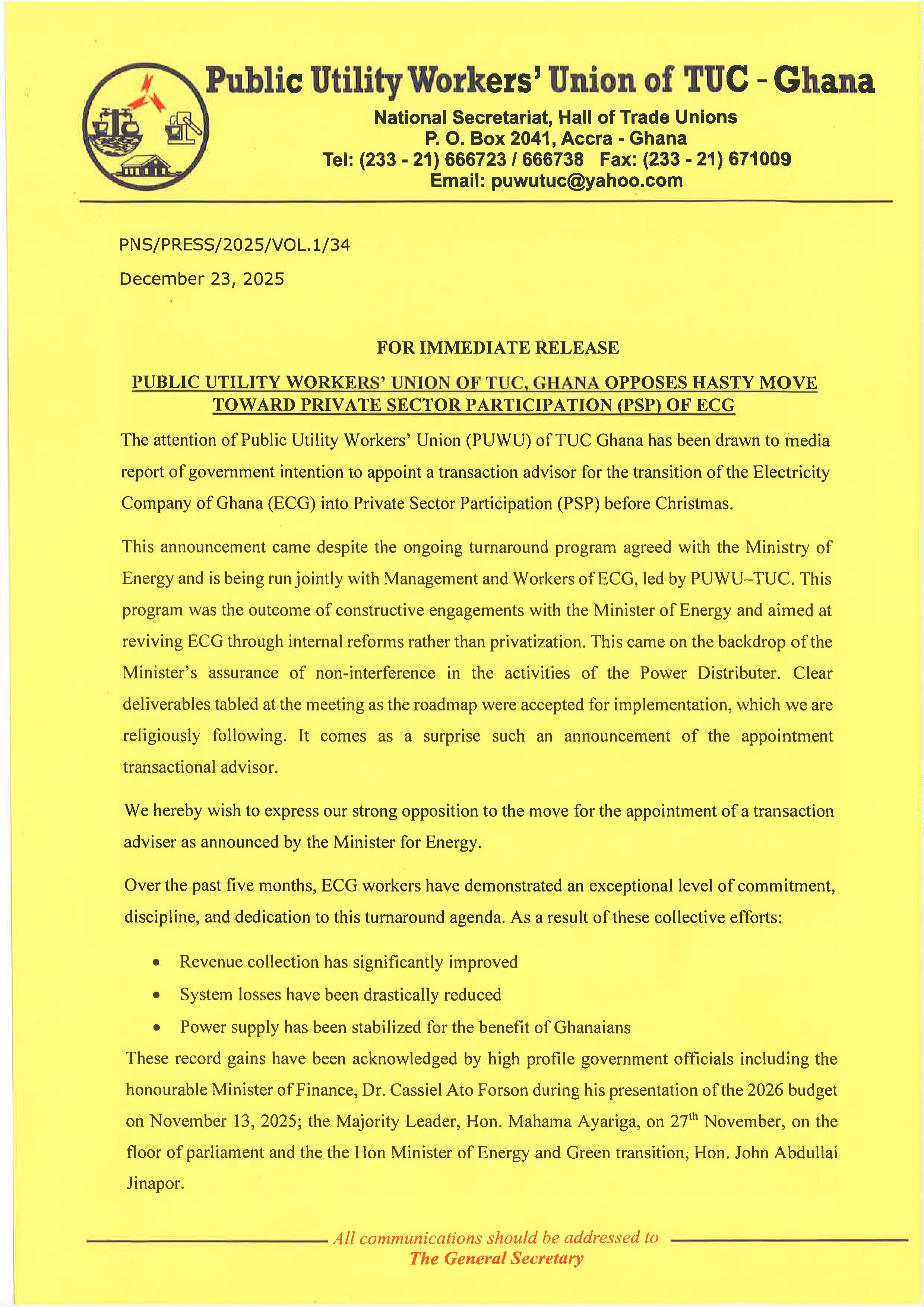 The Public Utility Workers’ Union of the Trades Union Congress (PUWU-TUC), Ghana, has strongly opposed what it describes as a rushed government move toward private sector participation (PSP) in the Electricity Company of Ghana (ECG).