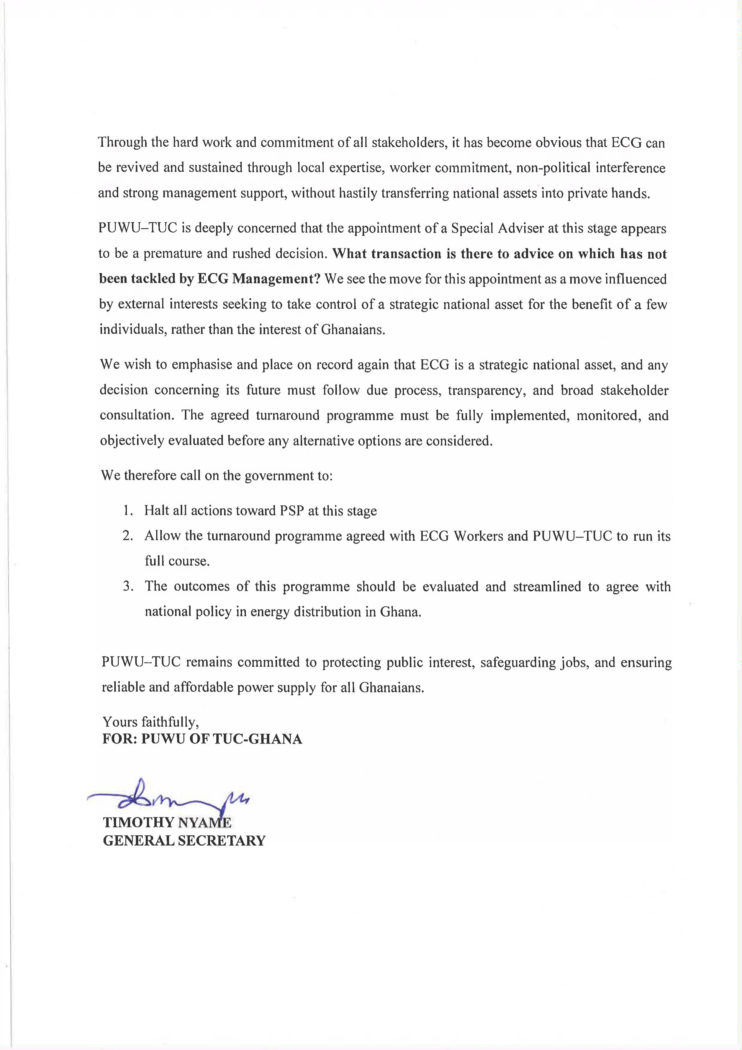 The union expressed concern that introducing a special or transaction adviser at this stage could open the door to external interests seeking control of a strategic national asset. It stressed that ECG can be revived and sustained through local expertise, worker commitment, effective management support, and minimal political interference.