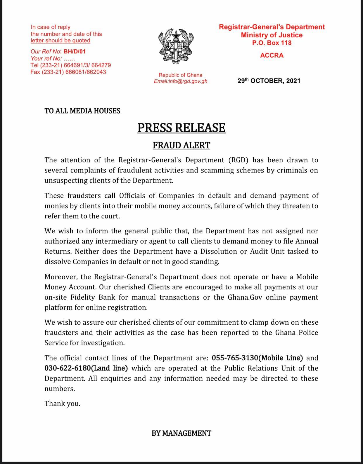 In a statement, the Registrar-General’s Department said its attention had been drawn to several complaints of fraudulent activities and scamming schemes by criminals on unsuspecting clients of the Department.