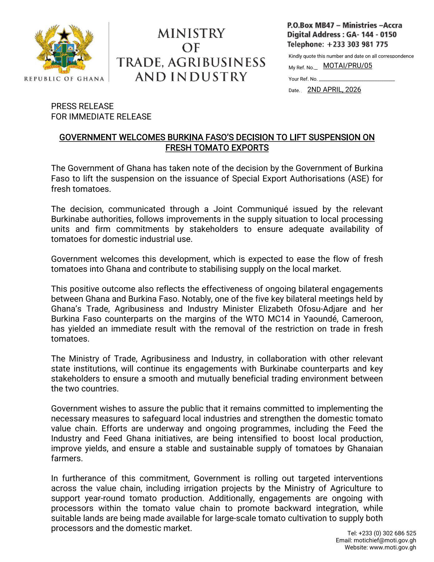 Ghana has welcomed the decision by Burkina Faso to lift its suspension on fresh tomato exports, a move expected to ease supply pressures and stabilise local markets.