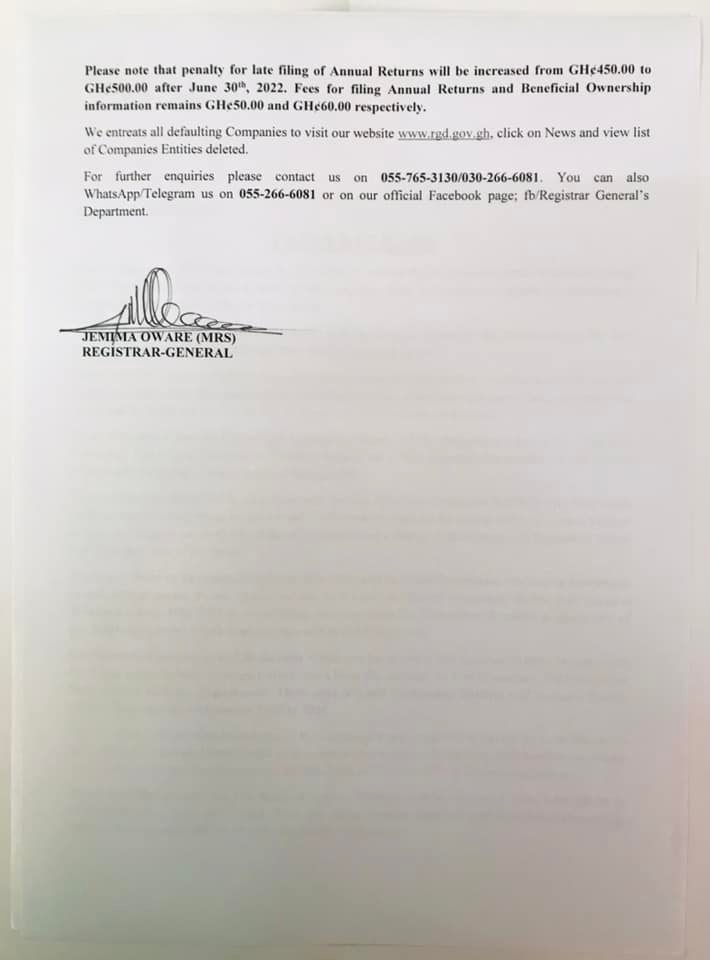 In new changes, the Registrar General’s Department has announced that the penalty for late filing of annual returns will be increased from 450 Cedi to 500 Cedi after 30th June 2022.