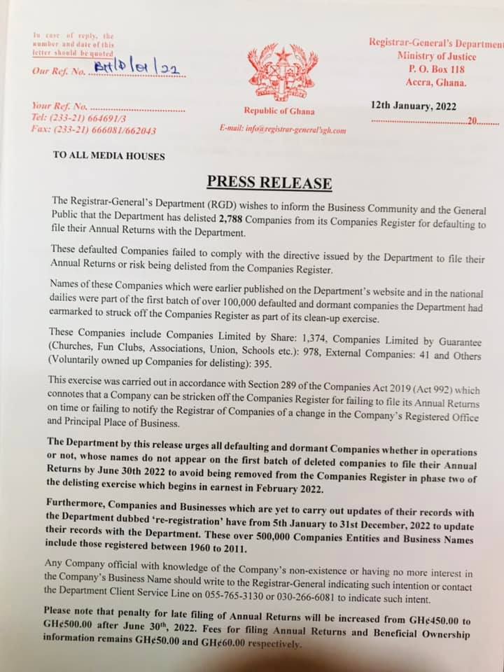 Registrar- General’s Department explained that the companies were delisted for failing to comply with a directive issued by the department to file their annual returns.