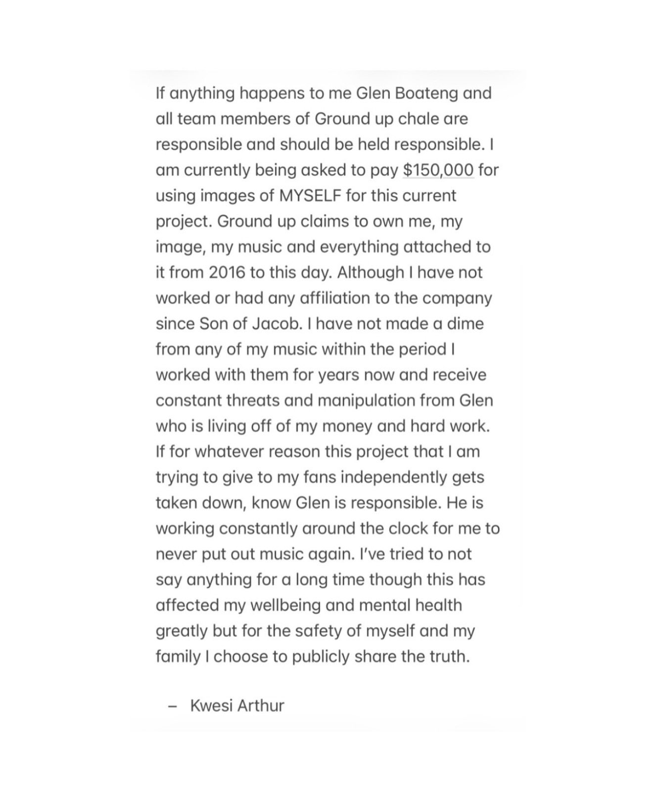 Ghanaian rapper and singer Kwesi Arthur has publicly accused his former record label, Ground Up Chale, of exploitation, manipulation, and intimidation in what he describes as a long-standing dispute over his music and personal brand.