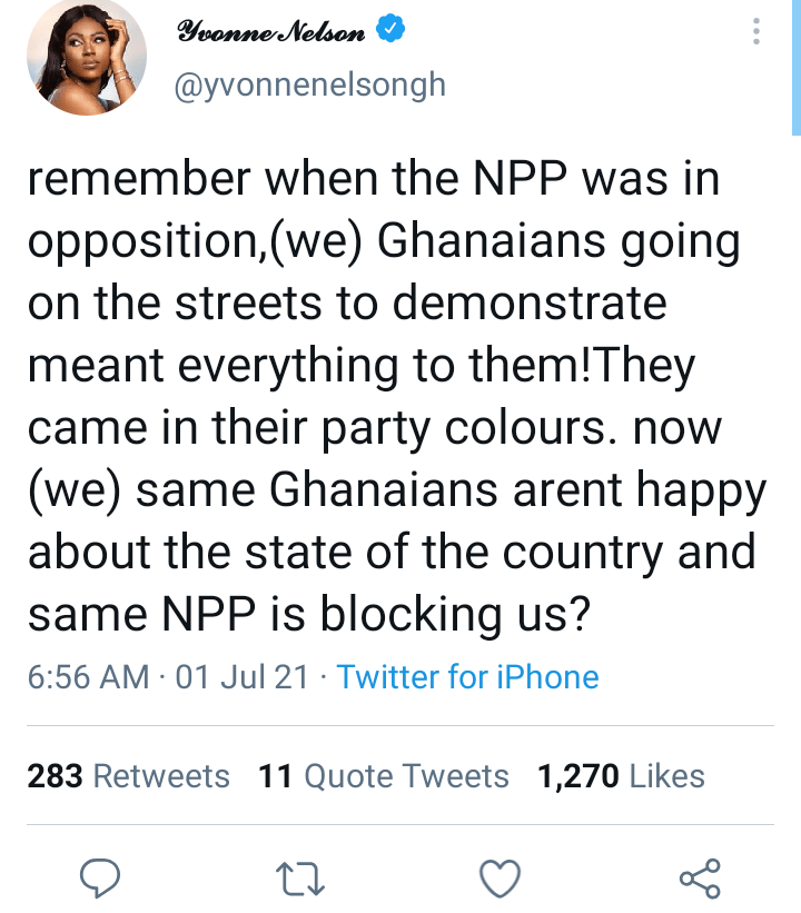 Ghanaian movie superstar, Yvonne Nelson, has condemned the governing New Patriotic Party (NPP) for what she claims to be a deliberate attempt to block demonstrations.