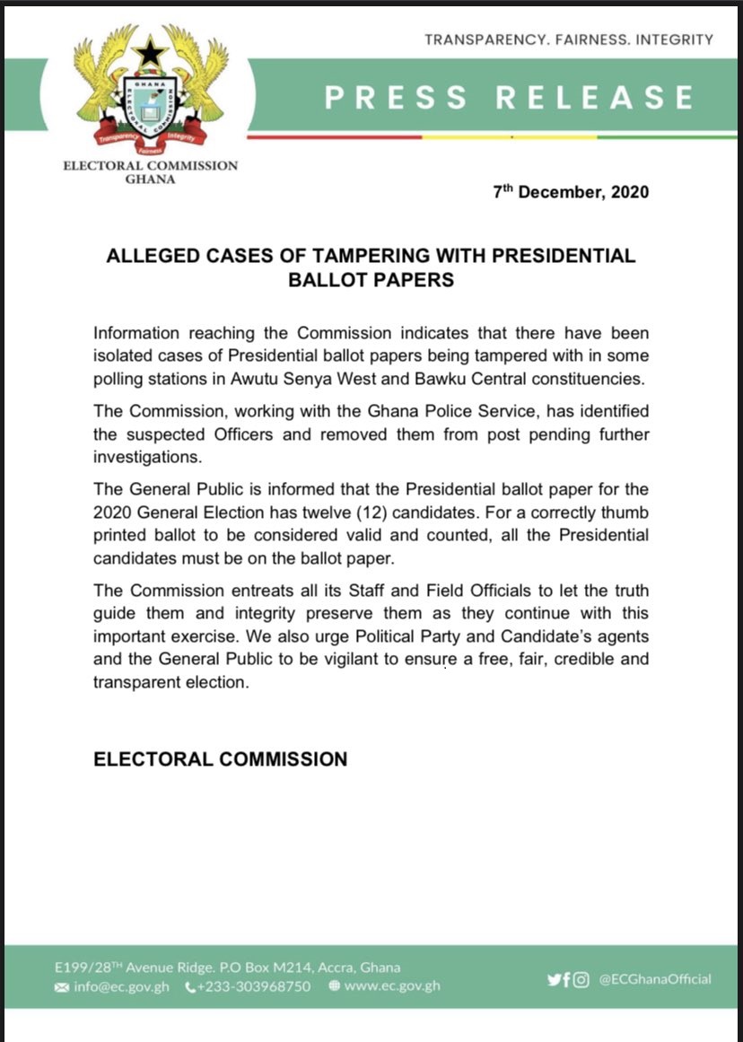 Portions of the EC statement said: "The General Public is informed that the Presidential ballot paper for the 2020 General Election has twelve (12) candidates. For a correctly thumb printed ballot to be considered valid and counted, all the Presidential candidates must be on the ballot paper".