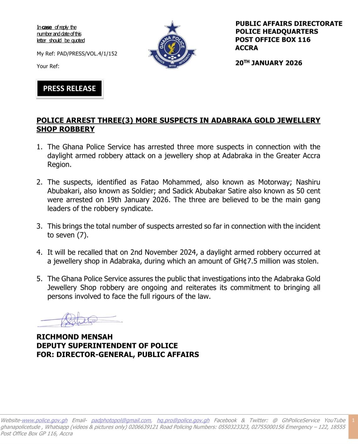 The Ghana Police Service has arrested three additional suspects in connection with the daylight robbery at a gold dealership in Adabraka, Accra, which involved the theft of cash and valuables estimated at GH¢7.5 million.