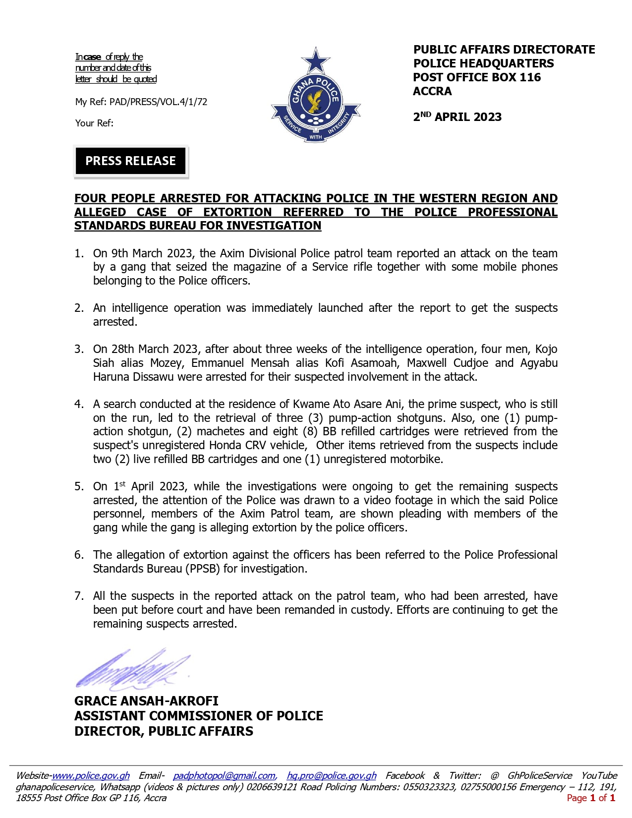 The Ghana Police Service added that the allegation of extortion against the officers had been referred to the Police Professional Standards Bureau (PPSP) for investigation.