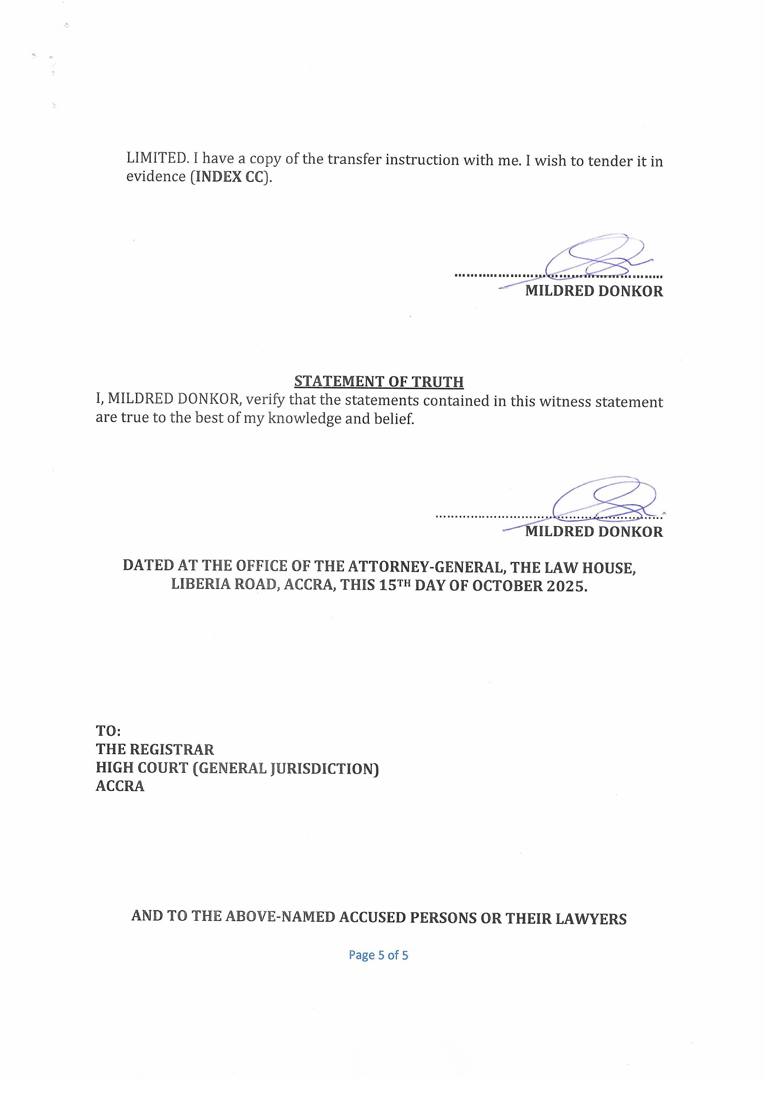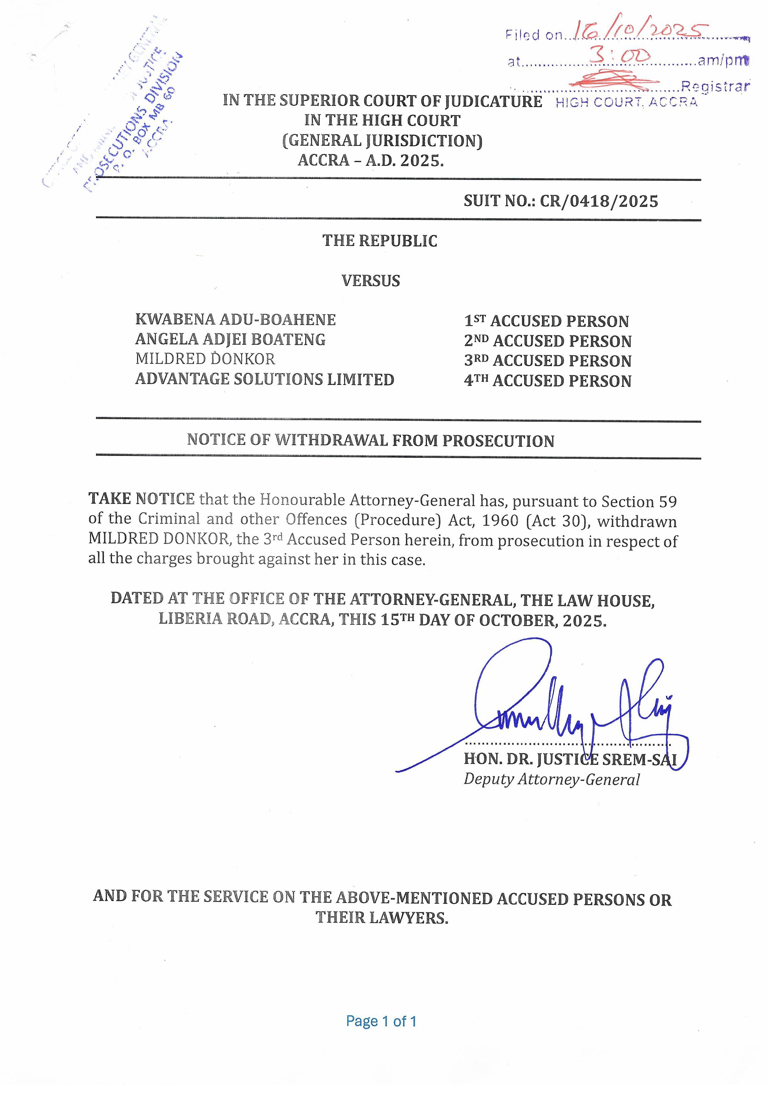 According to the notice filed at the High Court in Accra, “Mildred Donkor, the 3rd accused person, has been discharged from prosecution under Section 59 of the Criminal and Other Offences (Procedure) Act, 1960 (Act 30).”