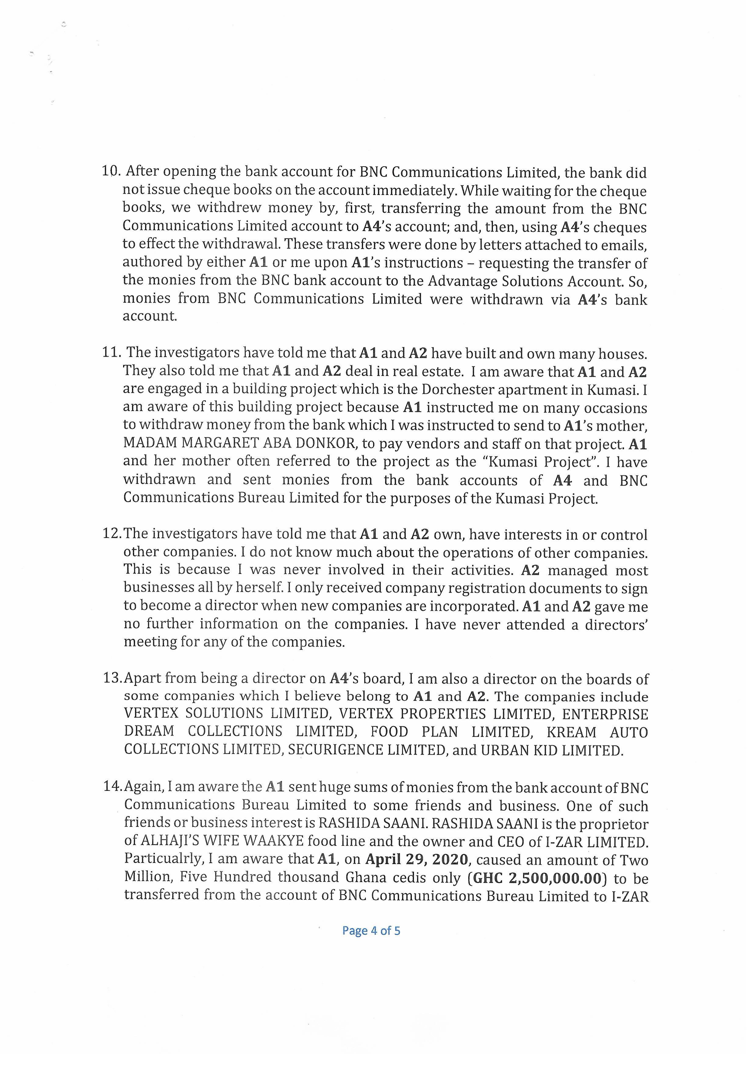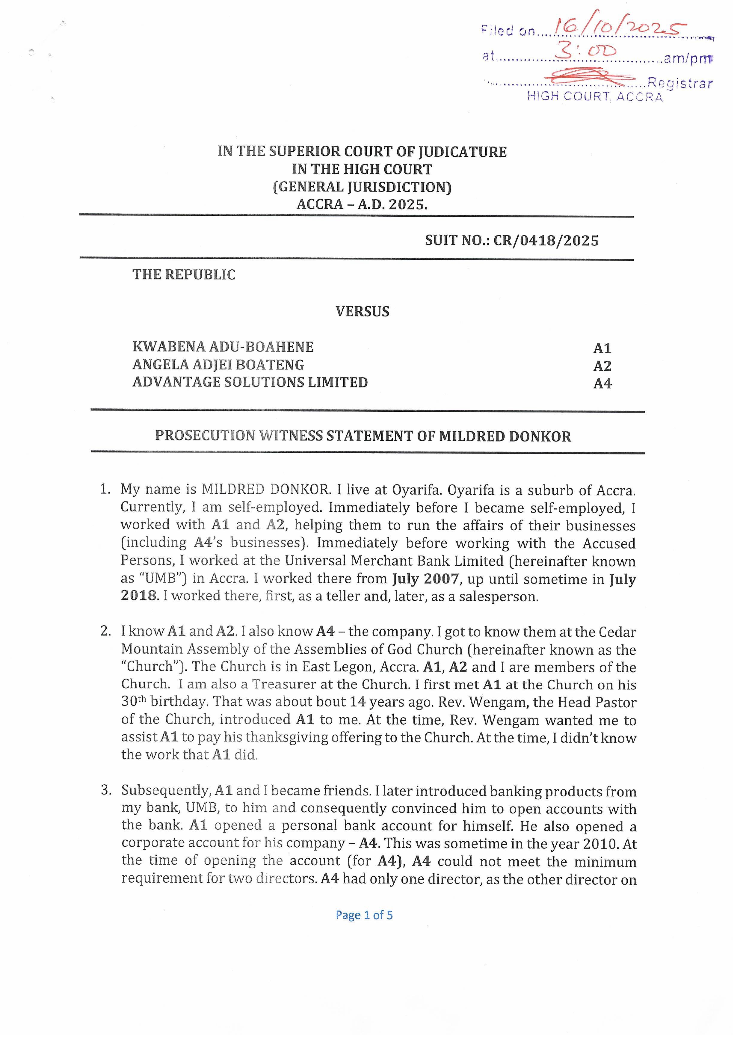 Mildred Donkor is expected to appear as a prosecution witness in the ongoing trial against Mr Adu-Boahene (1st Accused), Angela Adjei Boateng (2nd Accused), and Advantage Solutions Limited (4th Accused).