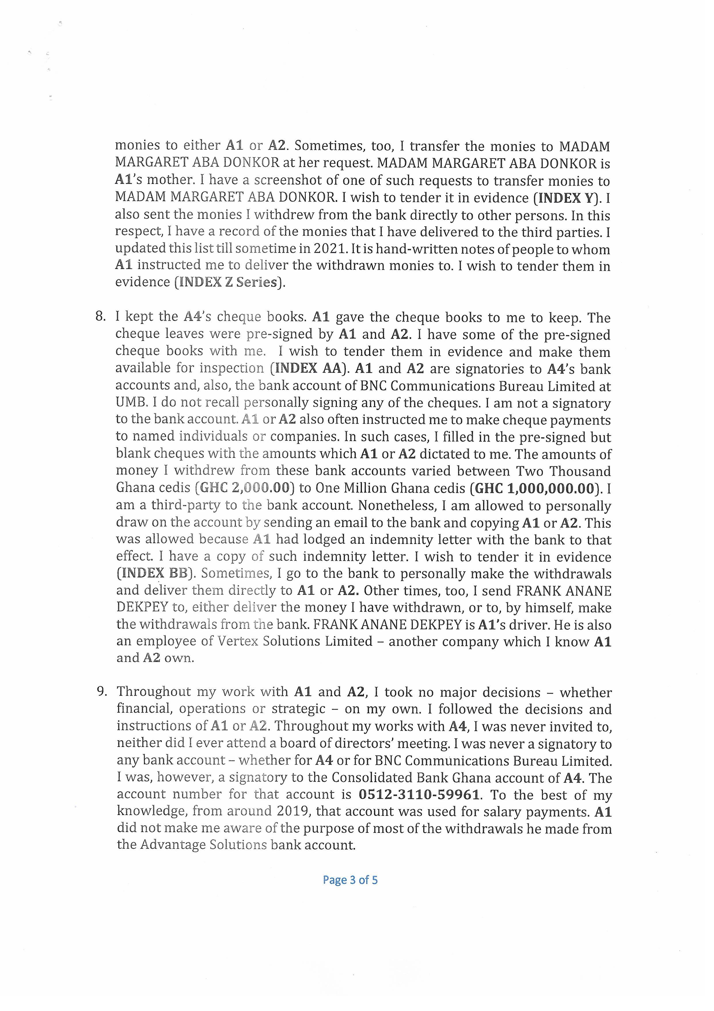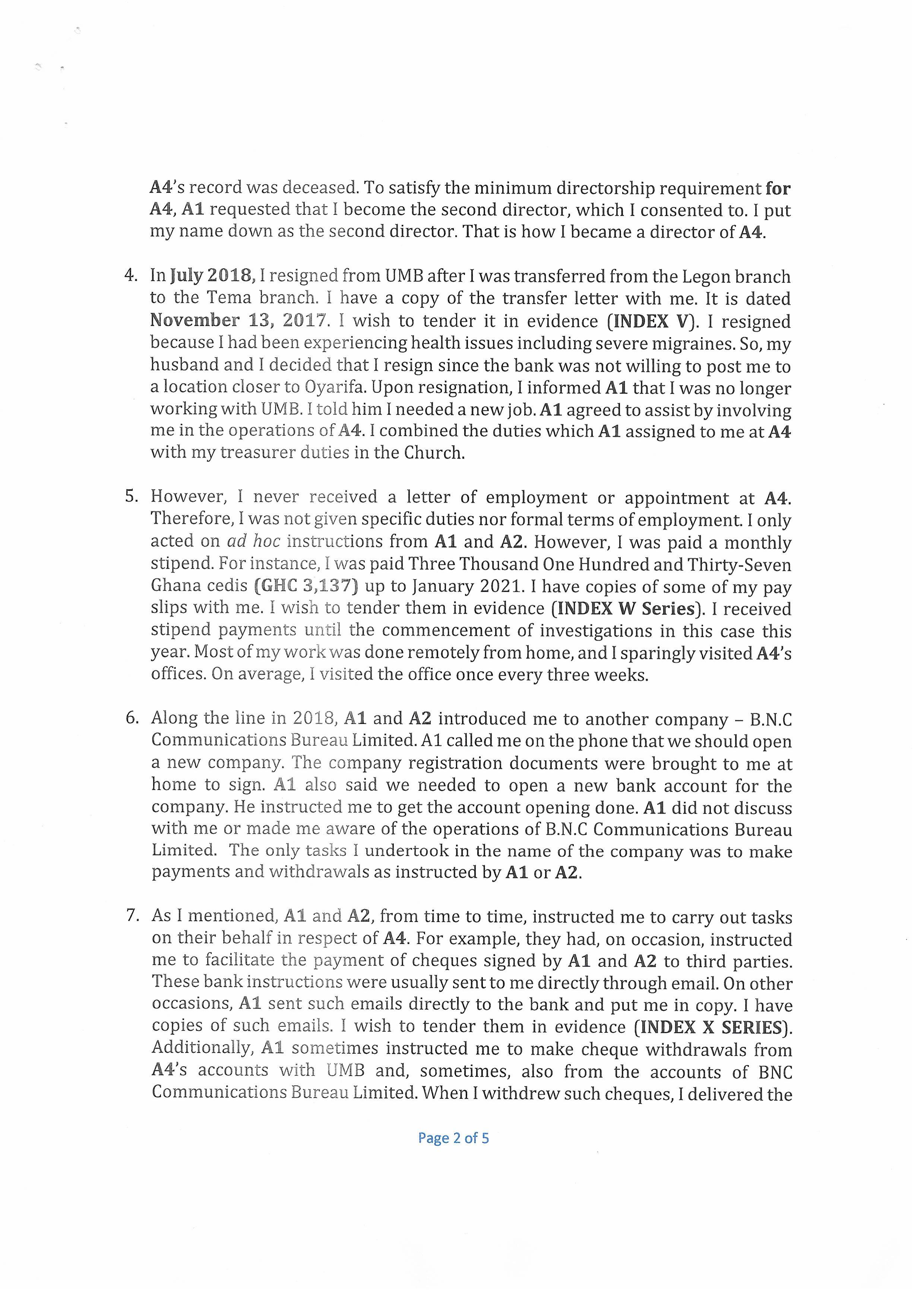 In her witness statement, Ms Donkor detailed her long working relationship with Mr Adu-Boahene and Madam Adjei Boateng, whom she described as acquaintances she met through the Cedar Mountain Assemblies of God Church in East Legon, Accra.
