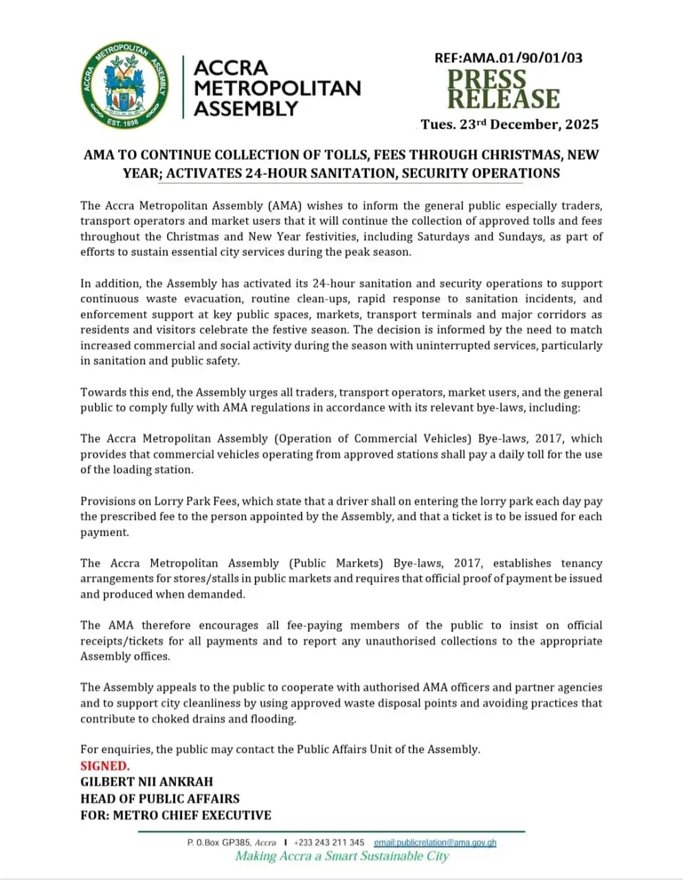 The Accra Metropolitan Assembly (AMA) has announced that it will continue the collection of approved tolls and fees throughout the Christmas and New Year festivities, including Saturdays and Sundays, to sustain essential city services during the peak season.