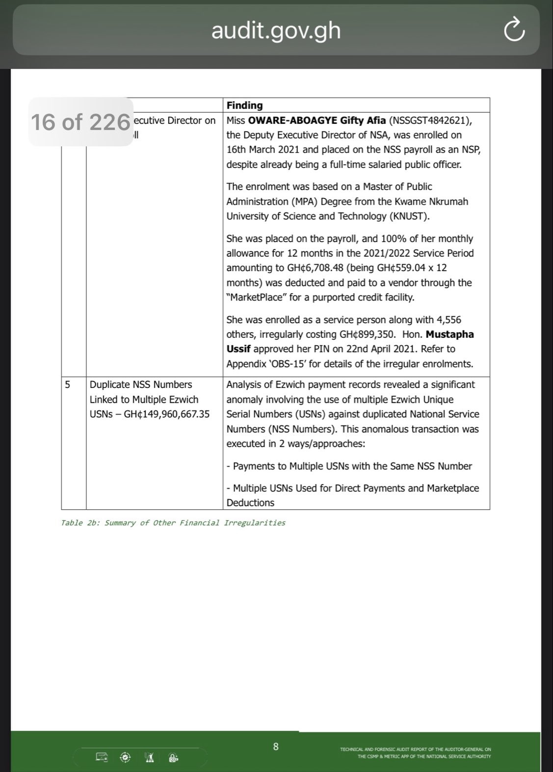 A new forensic report by the Auditor-General has found that Gifty Oware-Mensah, a former Deputy Executive Director of the National Service Authority, was wrongly listed as a national service person while she was already serving as a full-time public officer.