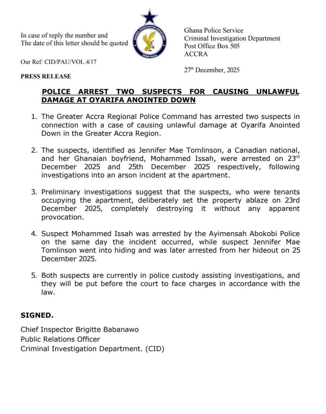 “Suspect Mohammed Issah was arrested by the Ayimensah Abokobi Police on the same day the incident occurred, while suspect Jennifer Mae Tomlinson went into hiding and was later arrested from her hideout on 25 December 2025,” the release added.