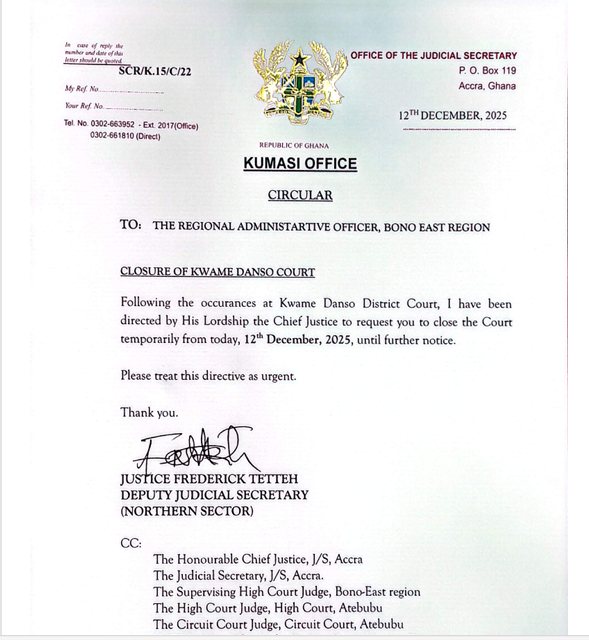 In a statement dated December 12, 2025, Deputy Judicial Secretary for the Northern Sector, Justice Frederick Tetteh, directed the Bono East Regional Administrative Officer to shut down the court “until further notice” on the instructions of the Chief Justice. The directive was described as urgent.