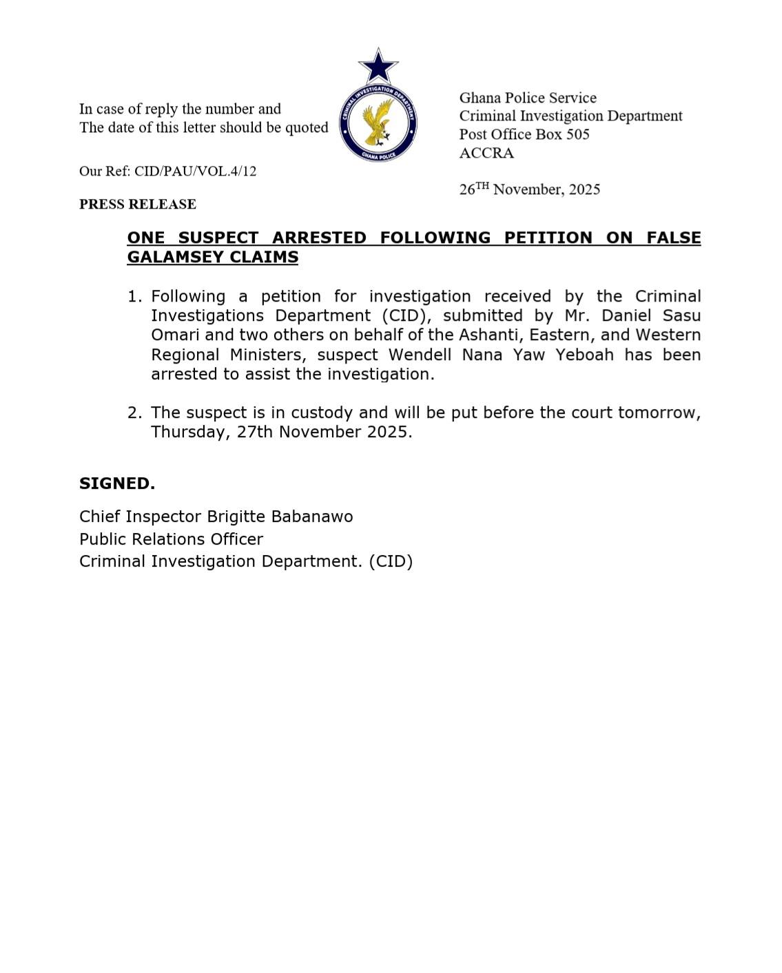 The Criminal Investigations Department (CID) has arrested one Wendell Nana Yaw Yeboah following a petition submitted by three regional ministers over what they describe as false and damaging galamsey allegations.