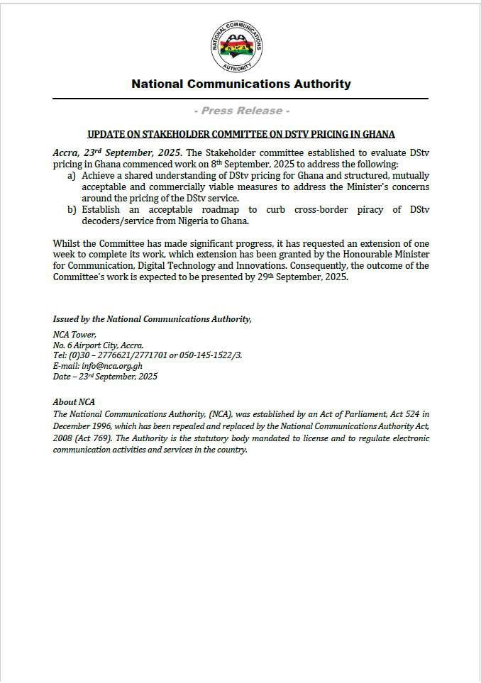In a statement on Tuesday, September 23, the National Communications Authority (NCA) explained that the extension will allow the committee to complete its consultations and ensure its recommendations fully address the Minister’s concerns over DSTv’s pricing structure.