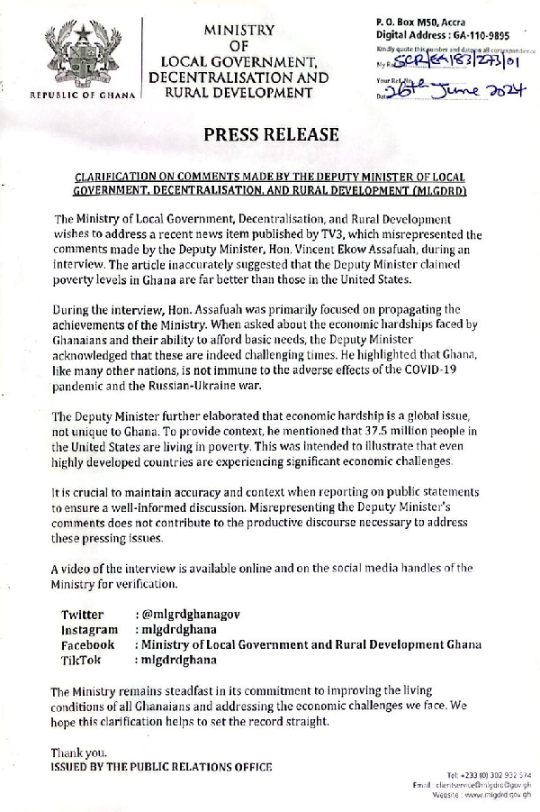 The Ministry of Local Government, Decentralisation, and Rural Development (MLGRD) has clarified that a recent report misrepresenting Deputy Minister Ekow Vincent Assafuah's comments on poverty levels in Ghana compared to the United States is incorrect.