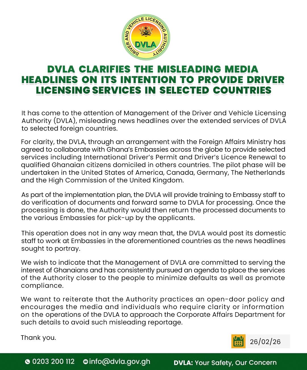The Driver and Vehicle Licensing Authority (DVLA) has clarified reports suggesting that it intends to establish full-scale driver licensing operations in selected foreign countries, saying that media headlines circulating on its extended services abroad were misleading.