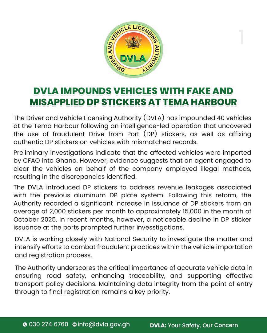The Driver and Vehicle Licensing Authority (DVLA) says it has impounded 40 vehicles at the Tema Harbour following an intelligence-led clampdown on the use of fraudulent Drive from Port (DP) stickers.