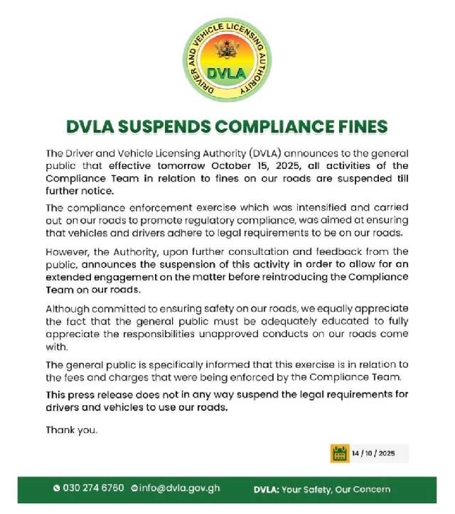 The Driver and Vehicle Licensing Authority (DVLA) has suspended all activities of its Compliance Team related to the imposition of fines on motorists, effective Wednesday, October 15, 2025.