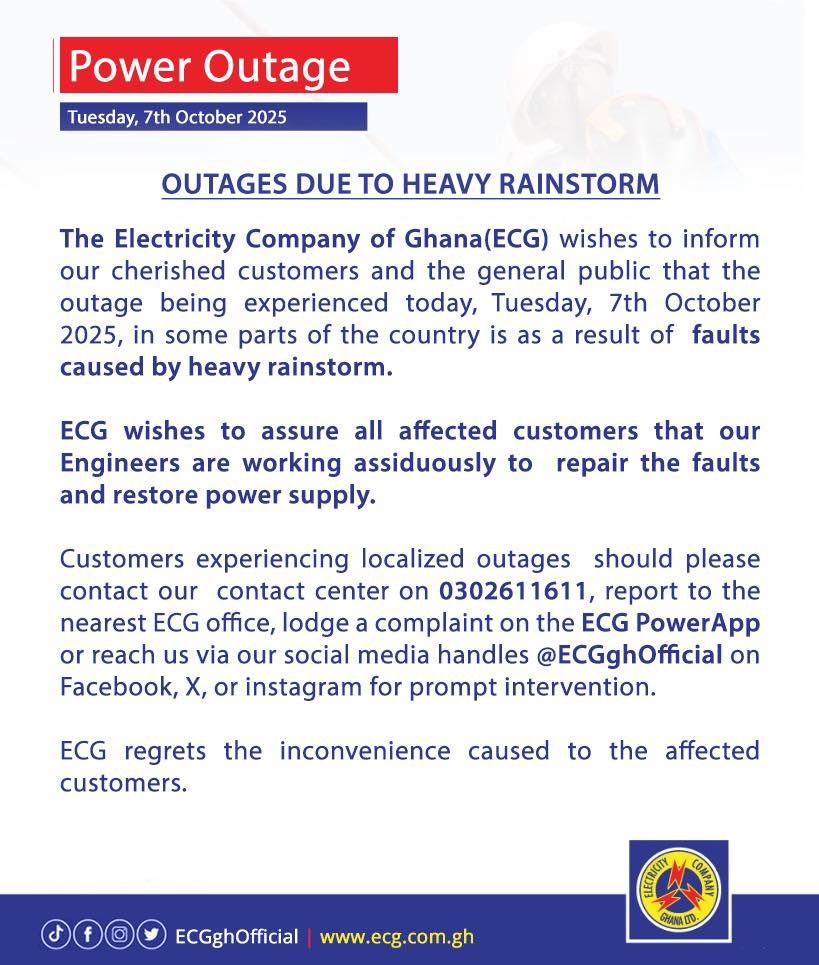 The Electricity Company of Ghana (ECG) has announced that parts of the country are experiencing power outages following a heavy rainstorm that hit on Tuesday, October 7, 2025.