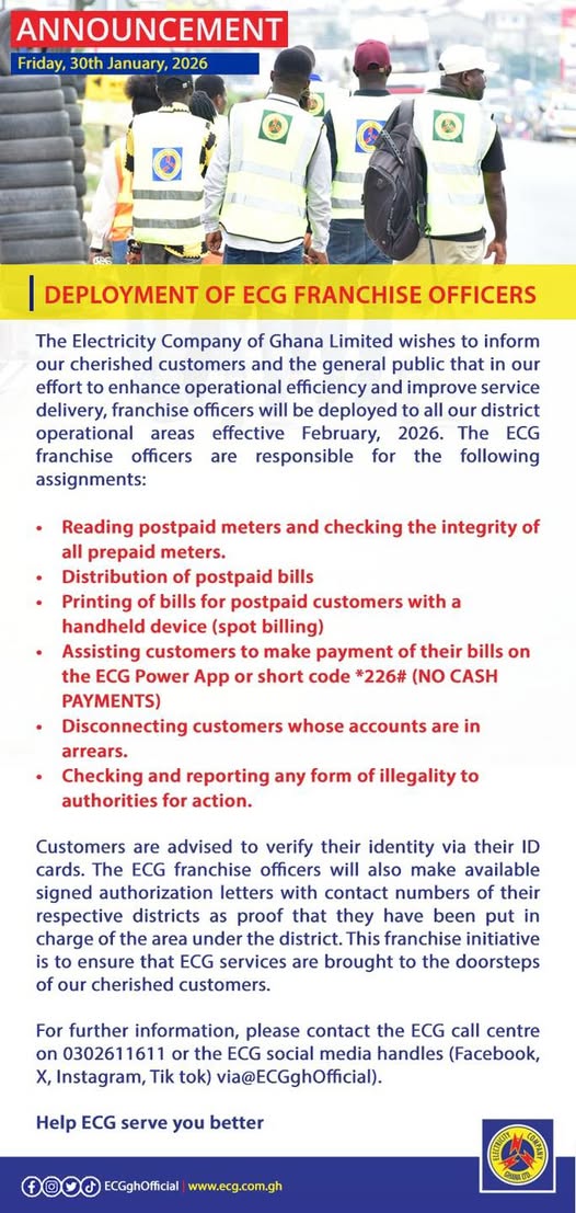 The Electricity Company of Ghana (ECG) has announced plans to deploy franchise officers across all district operational areas nationwide starting February 2026, in a move aimed at improving customer service and strengthening field operations.