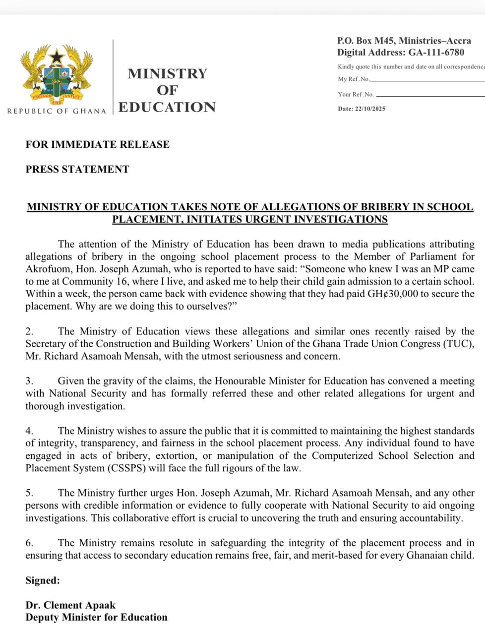 The Ministry of Education has launched investigations into allegations of bribery linked to the ongoing school placement process following reports involving the Member of Parliament for Akrofuom, Joseph Azumah.