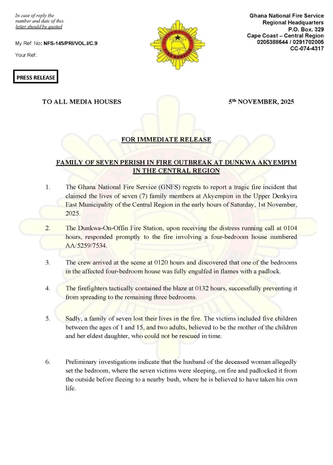 According to a statement issued by the Ghana National Fire Service (GNFS), the Dunkwa-On-Offin Fire Station received a distress call at 1:04 a.m. regarding a fire outbreak. Firefighters arrived at the scene at 1:20 a.m. and found one room of the four-bedroom houses completely engulfed in flames and locked from the outside.