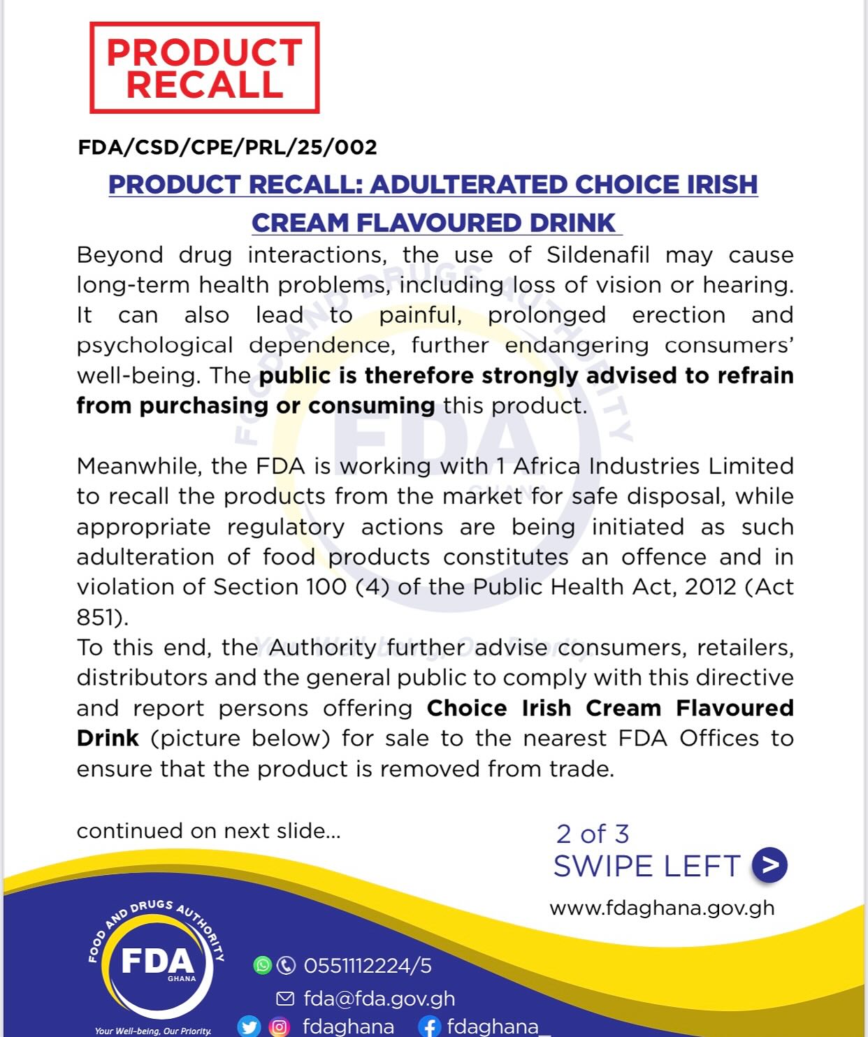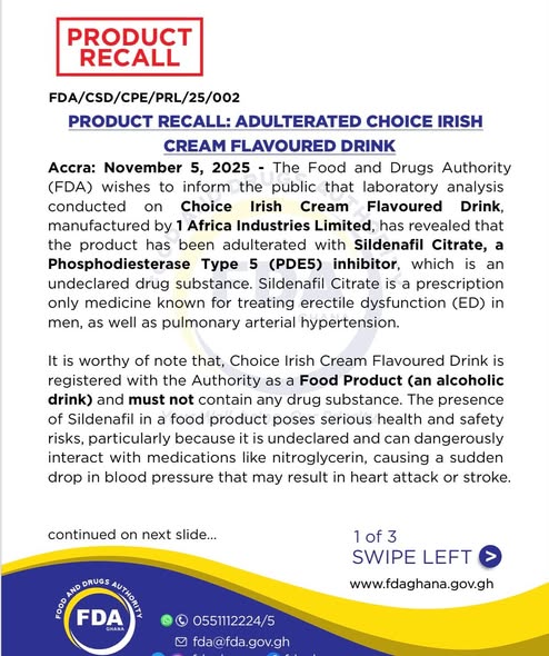 The Food and Drugs Authority (FDA) has directed the immediate recall of Choice Irish Cream Flavoured Drink, following laboratory tests that confirmed the presence of an undeclared prescription drug, Sildenafil Citrate.