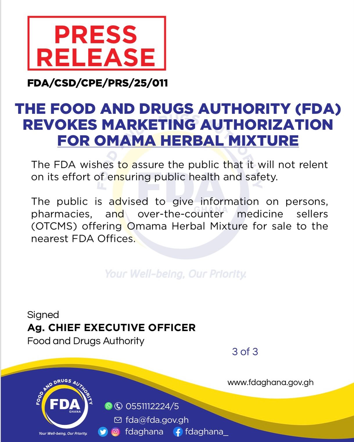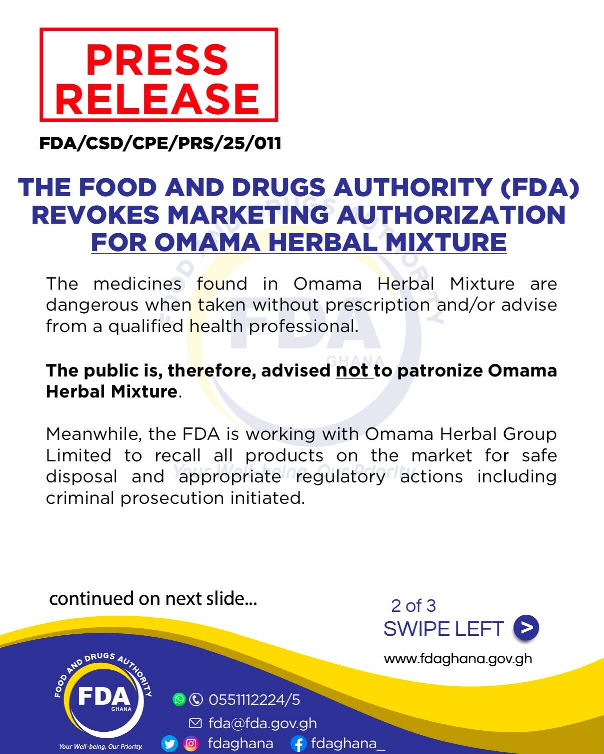 The Food and Drugs Authority (FDA) has revoked the marketing authorization for Omama Herbal Mixture after laboratory tests revealed that the product had been adulterated with prescription medicines.
