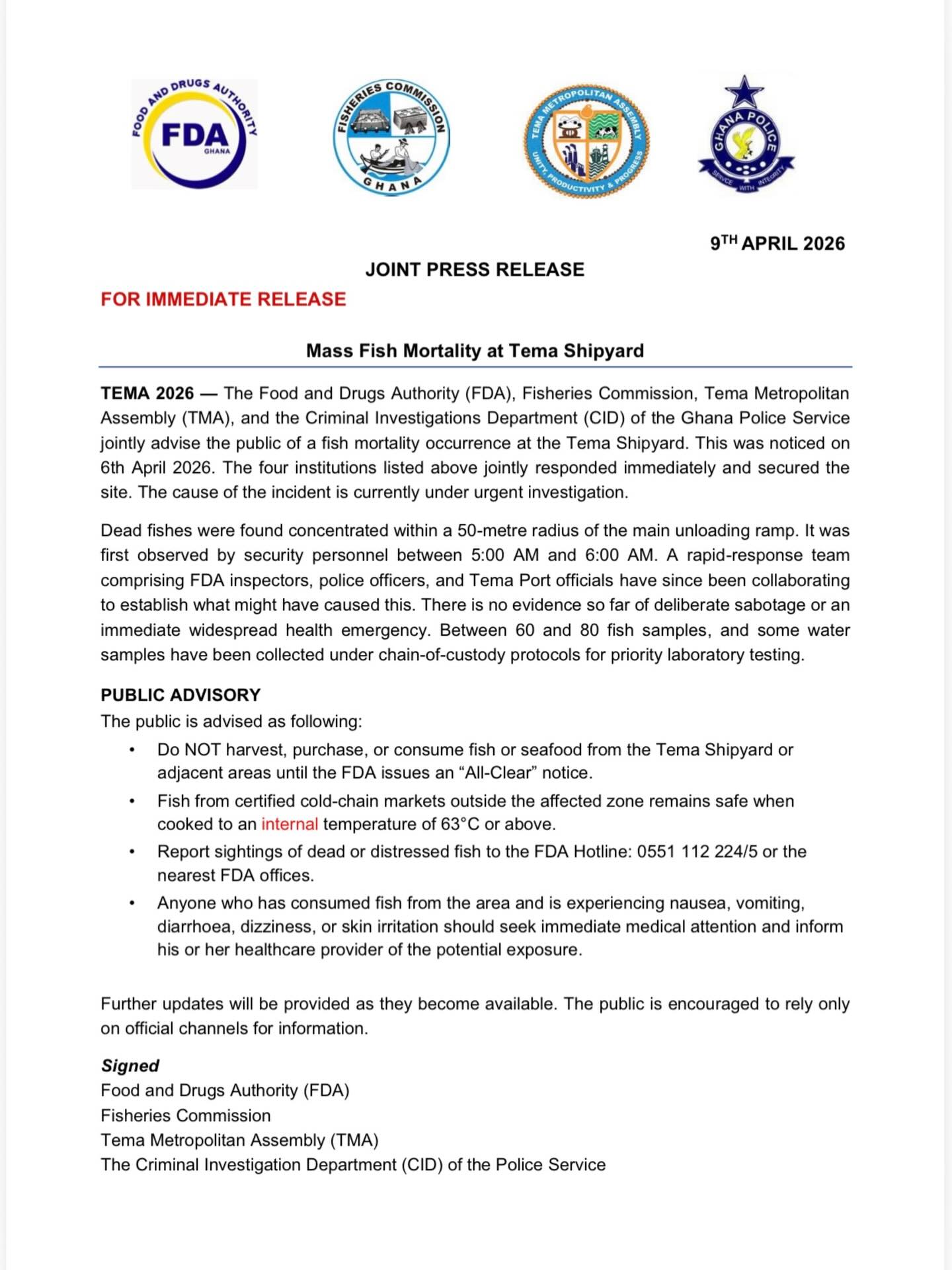 In a joint press release issued on April 9, 2026, the Food and Drugs Authority (FDA), Fisheries Commission, Tema Metropolitan Assembly (TMA), and the Criminal Investigations Department (CID) of the Ghana Police Service confirmed that the incident was first detected on April 6.