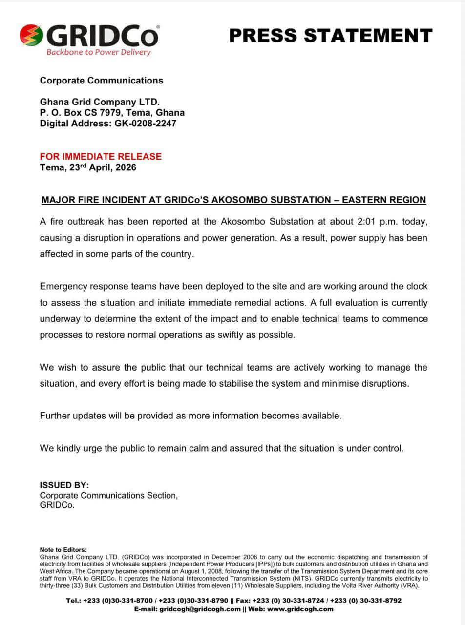 The Ghana Grid Company Limited (GRIDCo) has announced that a fire outbreak at the Akosombo Substation has disrupted operations, affecting electricity supply in parts of the country.