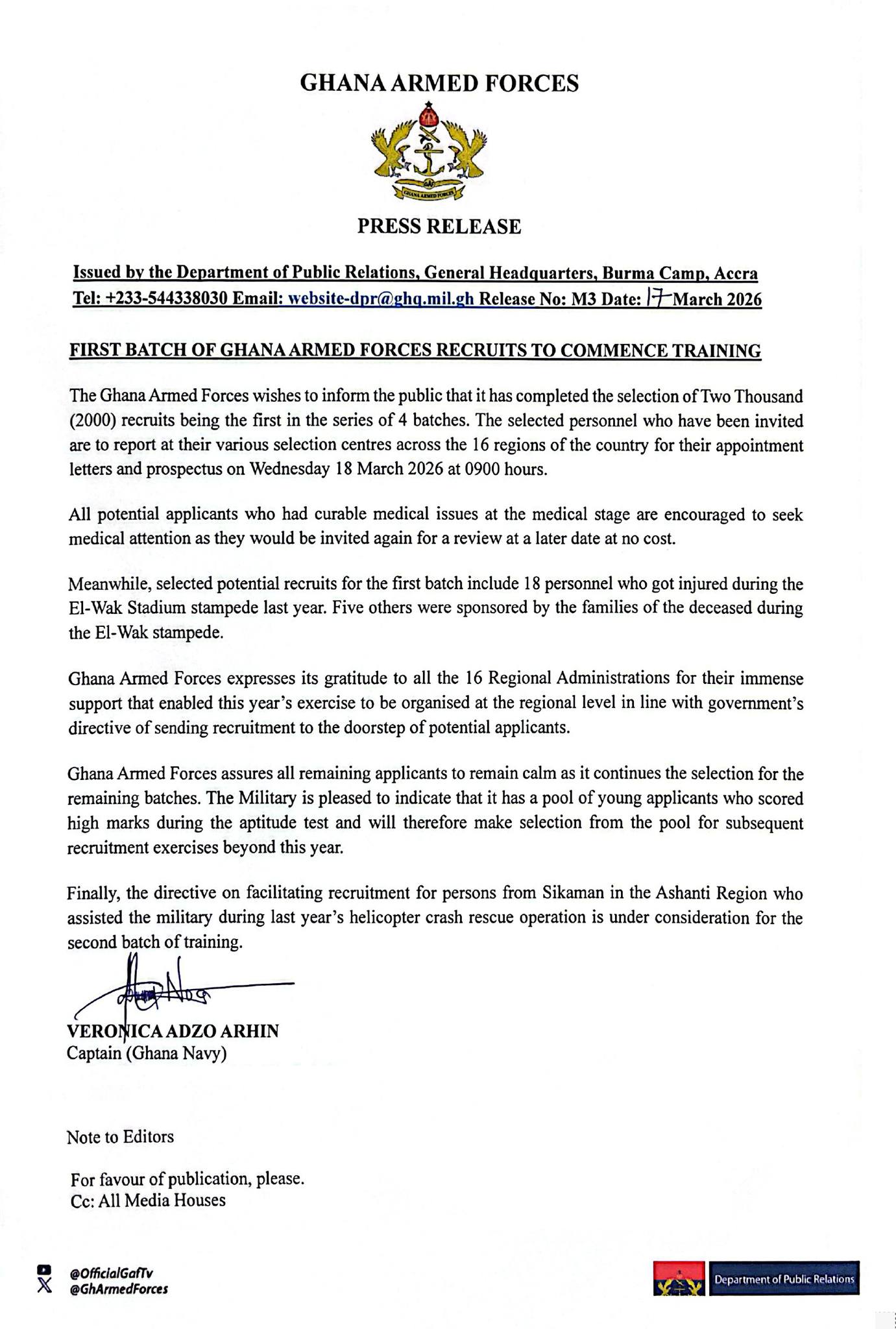 Selected candidates have been asked to report to their regional selection centres on Wednesday, March 18, at 9:00 a.m. to collect appointment letters and prospectuses. The announcement was made in a press release signed by Captain (Ghana Navy) Veronica Adzo Arhin, Acting Director-General of Public Relations for the GAF.