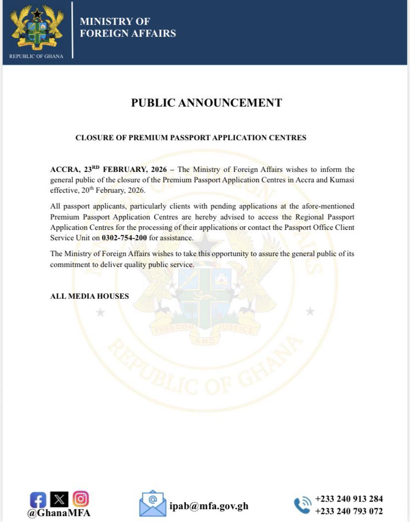 The Ministry of Foreign Affairs has announced the closure of the Premium Passport Application Centres in Accra and Kumasi, effective from February 20, 2026.