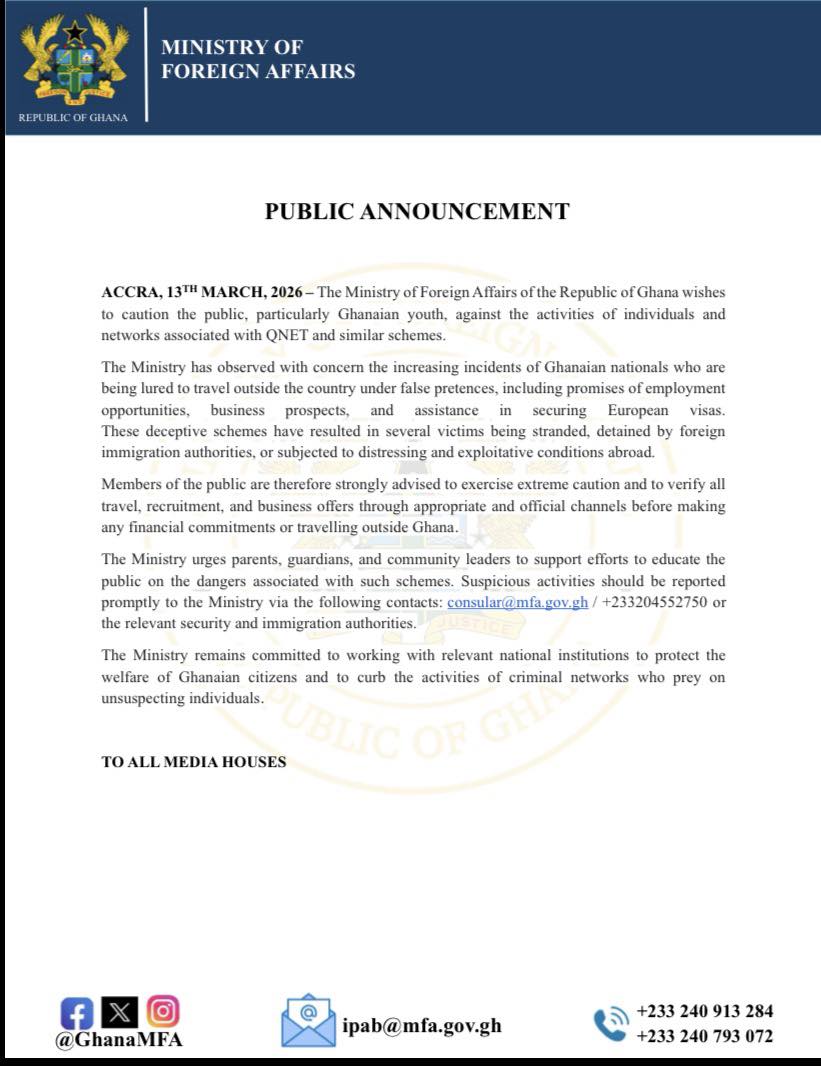 “The Ministry of Foreign Affairs of the Republic of Ghana wishes to caution the public, particularly Ghanaian youth, against the activities of individuals and networks associated with QNET and similar schemes.