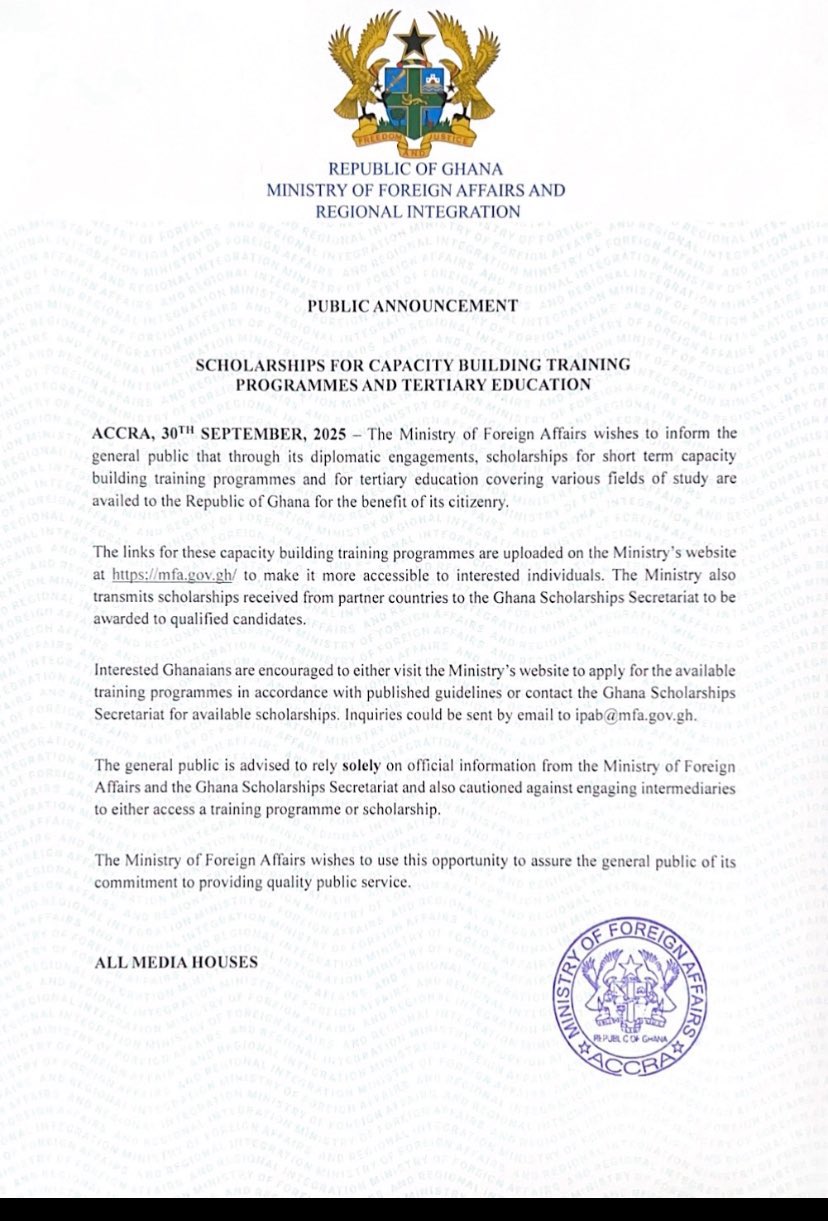 Itcautioned the general public against engaging with intermediaries. The announcement stressed the importance of relying solely on official information originating from the Ministry of Foreign Affairs and the Ghana Scholarships Secretariat to ensure fair access to a training programme or scholarship.