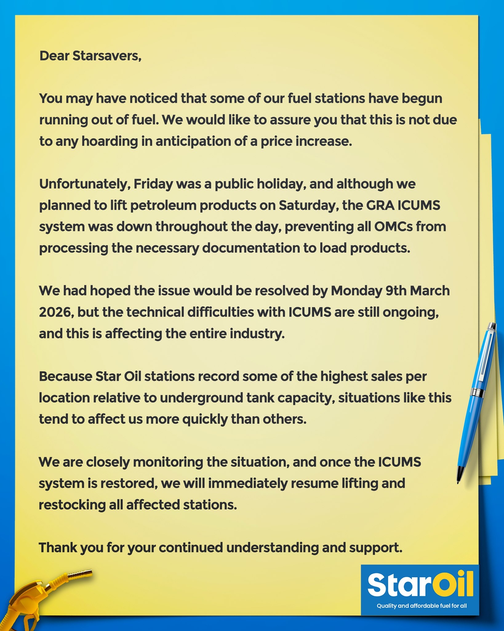 In a statement released on Monday, March 9, the company attributed the temporary stockouts to technical issues with the GRA ICUMS system, which delayed the processing of petroleum product deliveries across the industry.