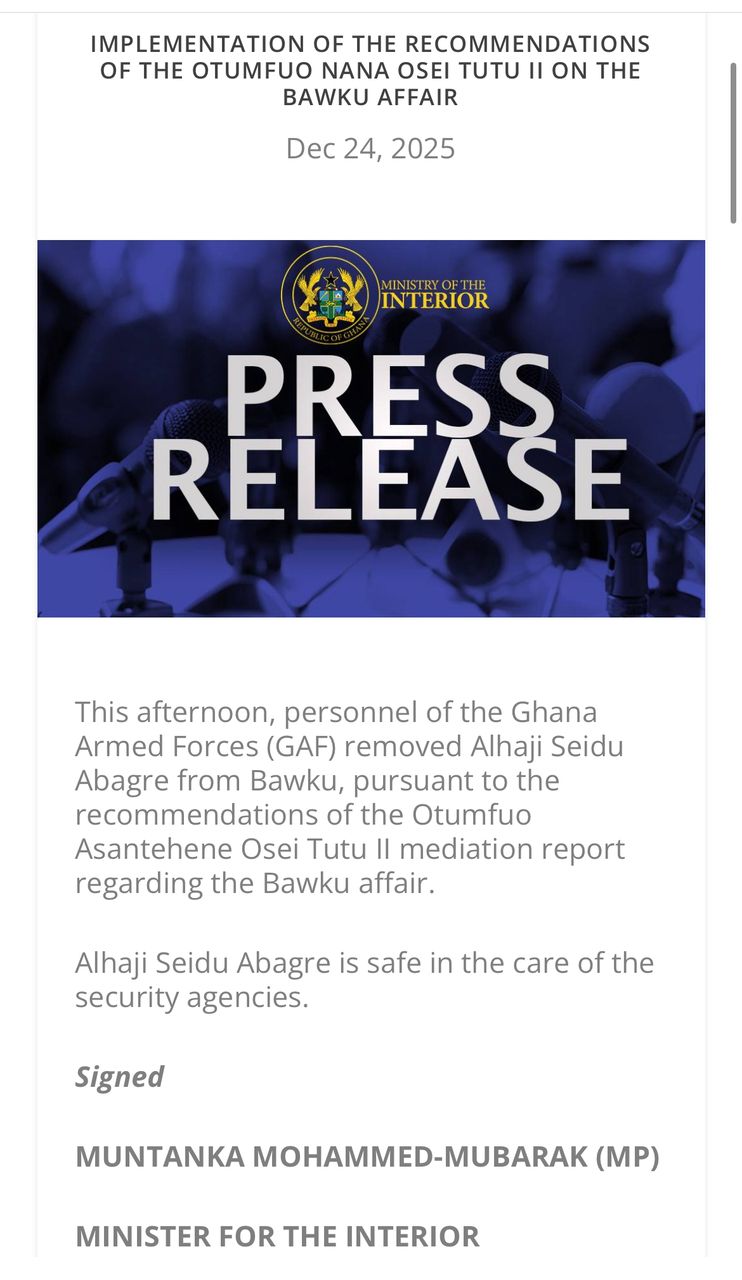 “This afternoon, personnel of the Ghana Armed Forces removed Alhaji Seidu Abagre from Bawku, pursuant to the recommendations of the Otumfuo Asantehene Osei Tutu II mediation report regarding the Bawku affair. Alhaji Seidu Abagre is safe in the care of the security agencies,” the statement noted.