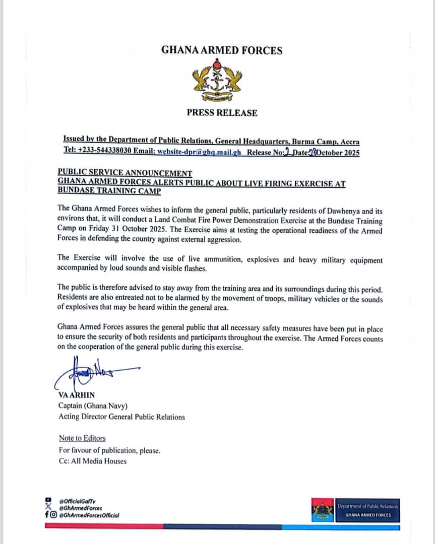 The Ghana Armed Forces (GAF) has announced that it will carry out a Land Combat Fire Power Demonstration Exercise at the Bundase Training Camp on Friday, October 31, 2025.