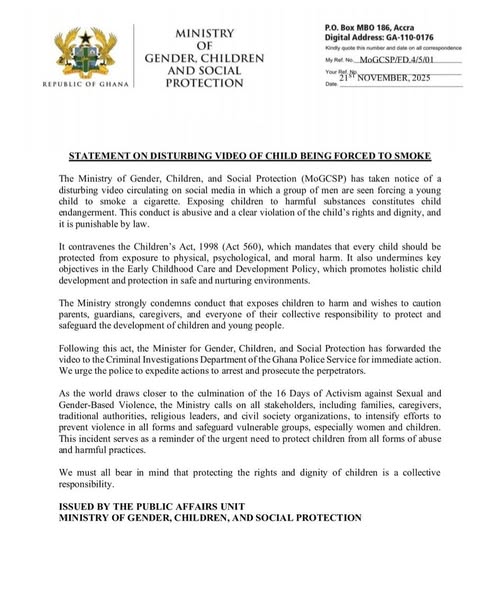 The incident comes as Ghana and the global community mark the final days of the annual 16 Days of Activism Against Gender-Based Violence. The Ministry emphasized that the video underscores the urgent need to protect children from all forms of abuse.